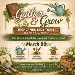 A new date for this event will be announced soon. The annual HK luncheon and training meeting is for all who serve in Highlands Kids,