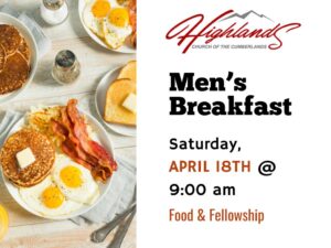 Join us for our FIRST MEN’S BREAKFAST! Bring your appetite to the Highland’s Cafe on Saturday, April 18th at 9:00 am. This will be a time to