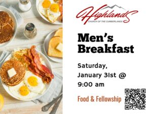 Join us for our FIRST MEN’S BREAKFAST! Bring your appetite to the Highland’s Cafe on Saturday, January 31st at 9:00 am. This will be a time to