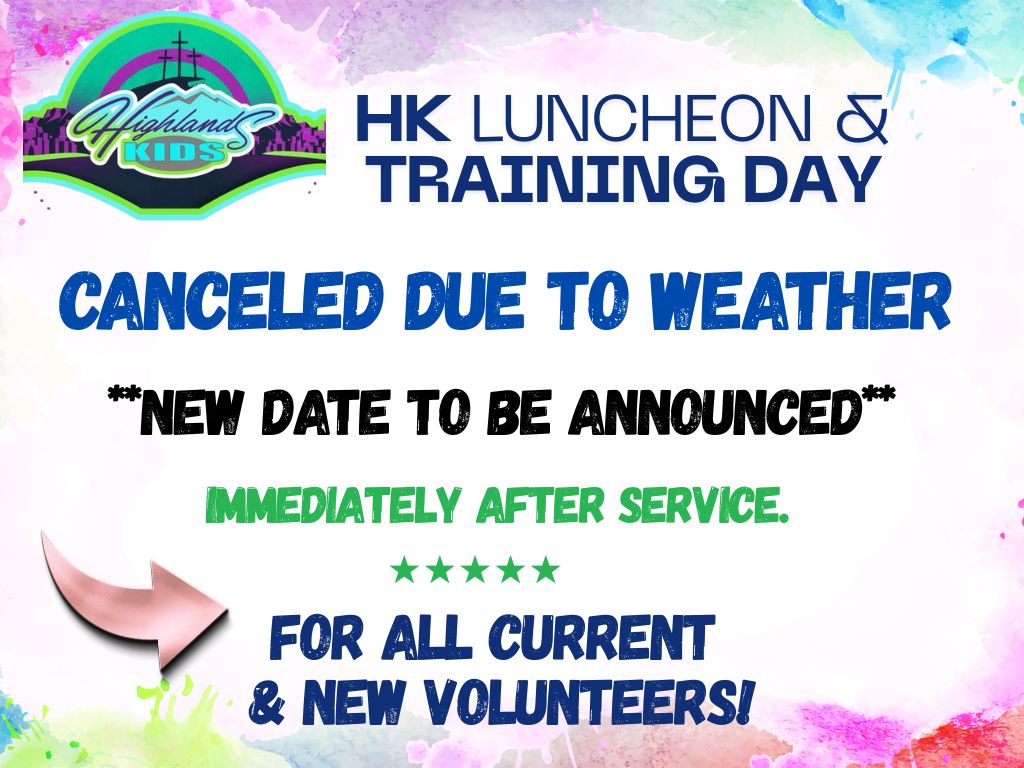 A new date for this event will be announced soon. The annual HK luncheon and training meeting is for all who serve in Highlands Kids, and for anyone interested in serving. Winter weather has forced the rescheduling of this meeting two weeks in a row. A new date is pending.